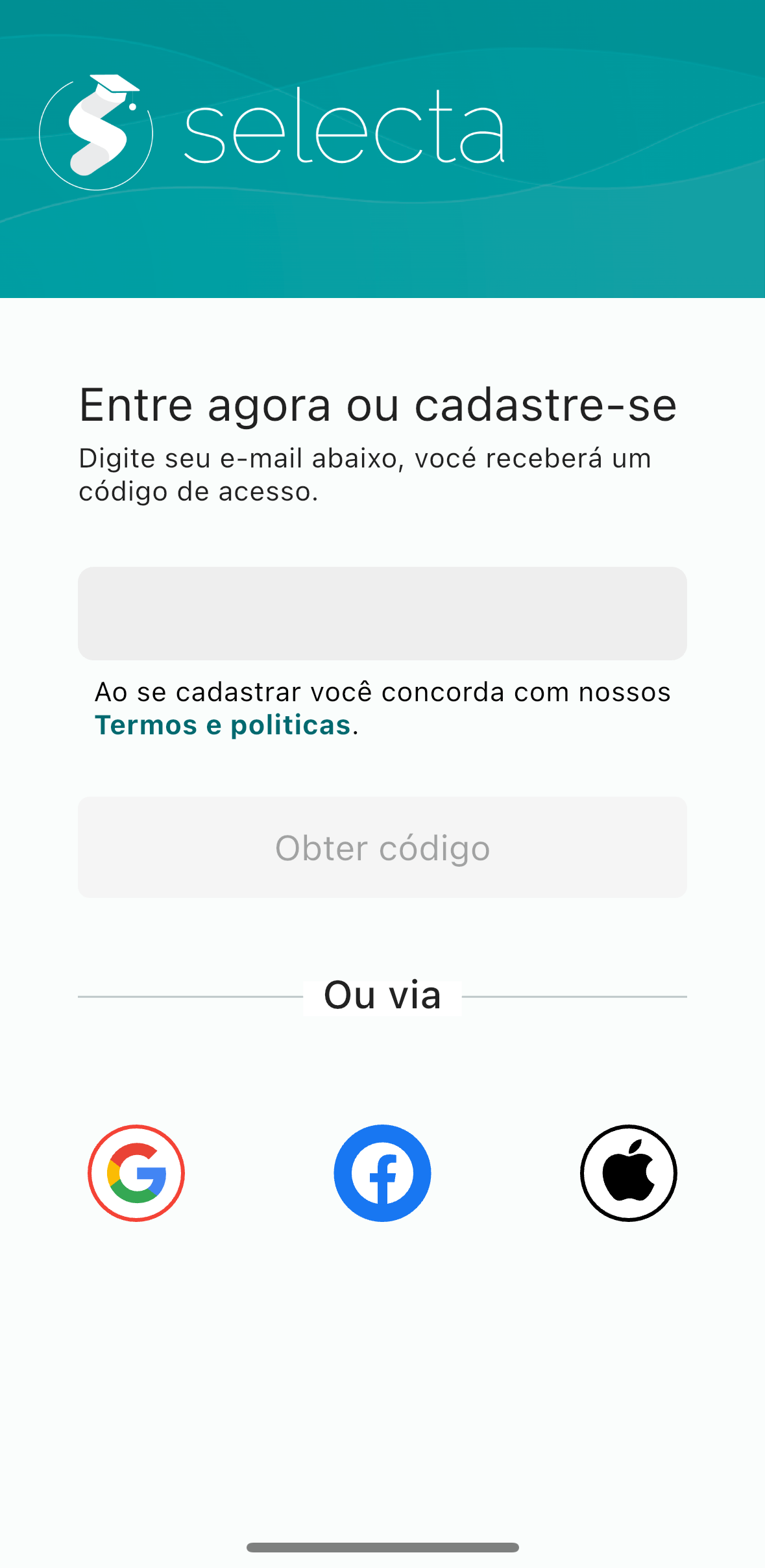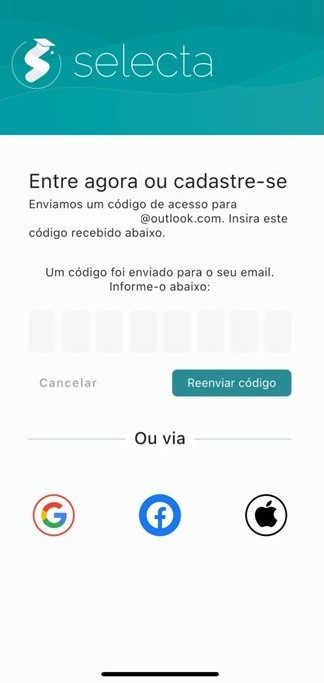 Você também pode entrar usando suas contas do Google, Facebook ou Apple. Nesses casos, o Selecta usará o e-mail vinculado à sua rede como identificação principal.