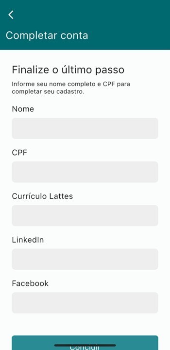 Se for seu primeiro login, você será convidado a completar seu cadastro. Basta preencher os seguintes dados: